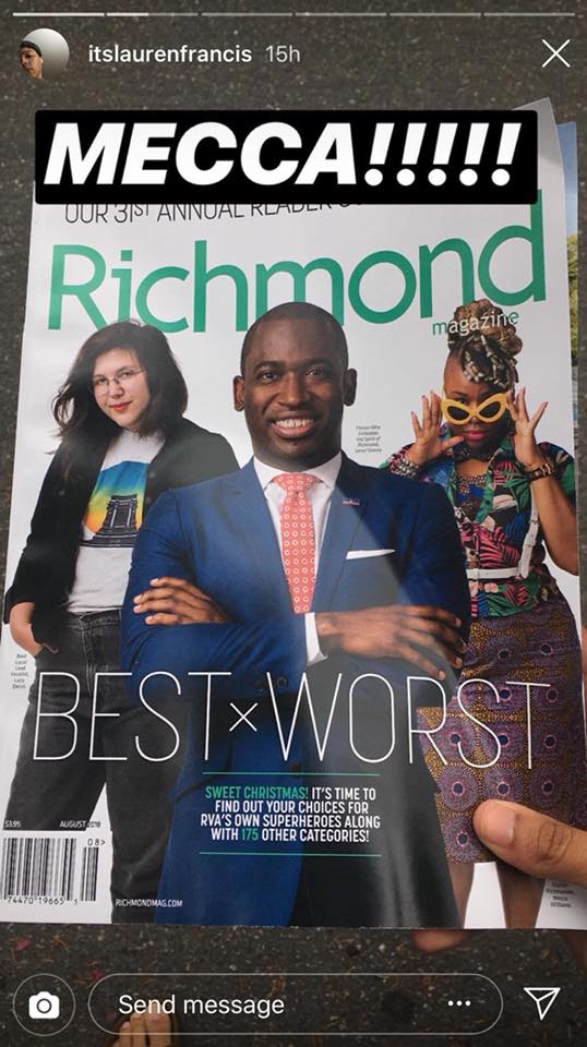 There are early covers of Richmond Magazine’s Best and Worst Issue floating around IG. And I noticed a few things awesome with the cover. The first is personal: Lucy Dacus, who if you don’t know, is one of the fastest growing stars in indie rock music (Maggie Walker grad – now signed to Matador Records) is sporting a New Legacy Tee on the cover of the magazine. Mind Blown with that alone. S/O Mecca Williams, just amazing person who is leading Style and Blackness in Richmond, and of course, Mayor Stoney. #WESEEIT